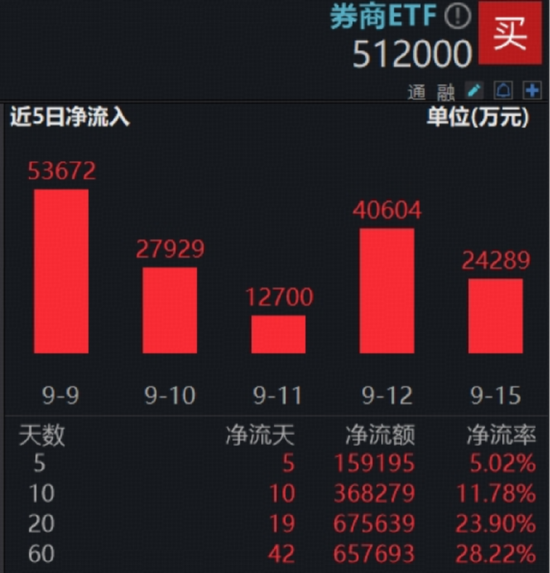 值得一提的是,券商板块资金面持续火热。上交所数据显示,券商ETF(512000)已连续13个交易日净流入,合计达44.26亿元。