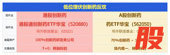 只投创新药,认准港股通创新药ETF华宝(520880),100%布局创新药研发类公司,前十大权重股占比超七成,龙头属性突出,底层资产是港股,具备高弹性特征及T+0优势。