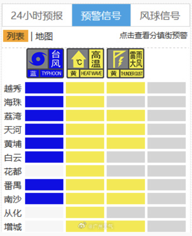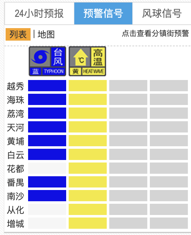 截至13:30,除花都、从化、增城外,广州多区升级至台风蓝色预警,11区高温黄色预警生效中。