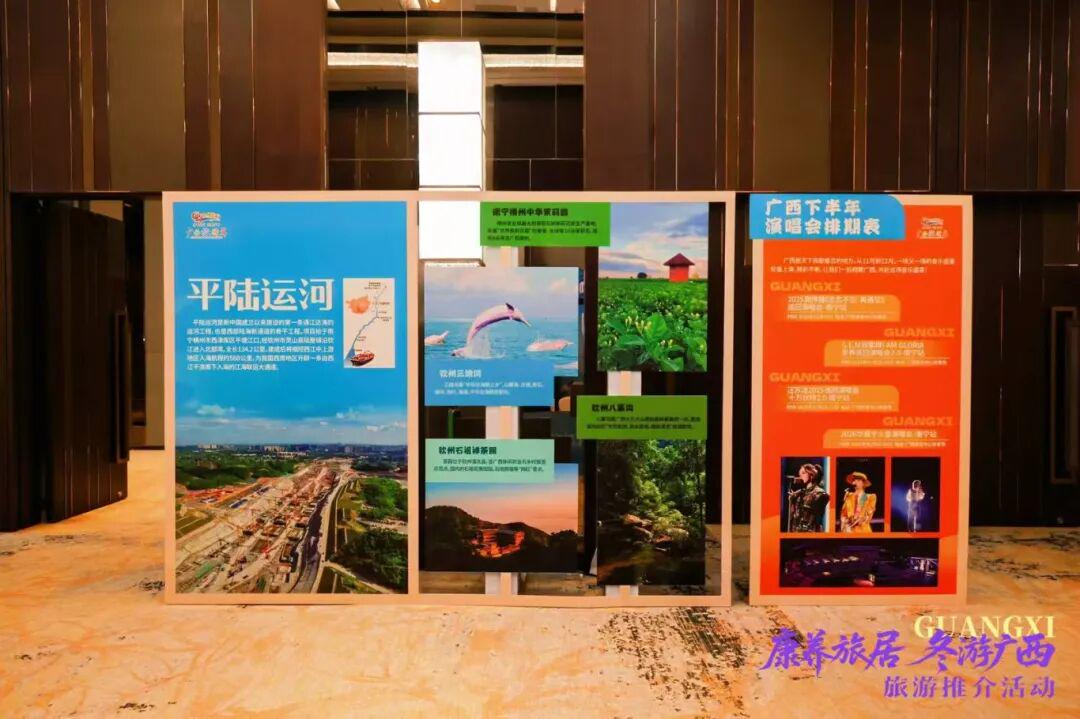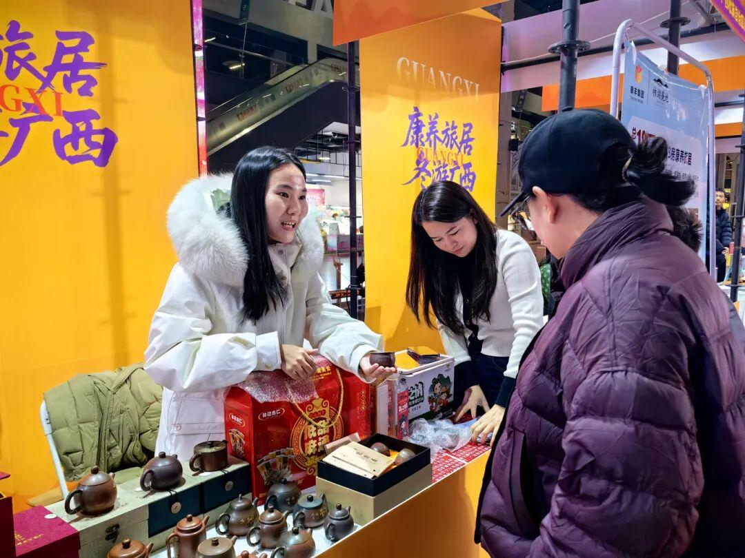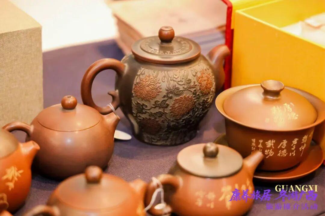旅游推介活动现场的钦州展台,精美的钦州坭兴陶作品、地道的钦州特产与旅游资源展示相得益彰,宾客们一边观看推介,一边感受钦州好物,纷纷表示出对滨海运河城钦州的向往,与冬季出行钦州的意愿。