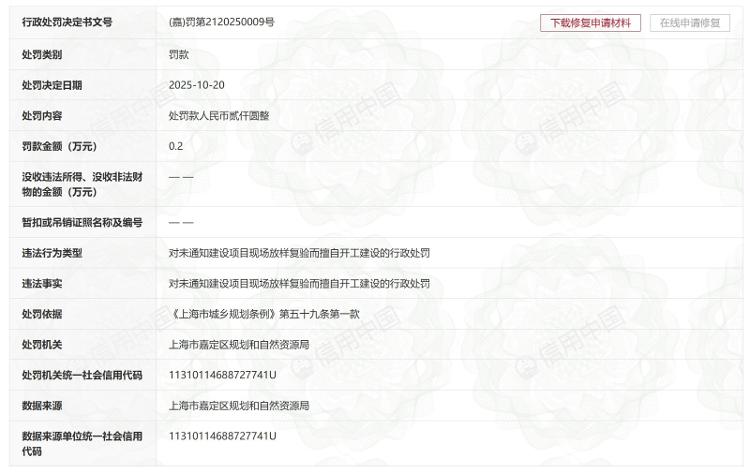 此外,2024年7月,该公司还因将建设工程肢解发包、未取得施工许可证擅自施工,被上海市嘉定区建设和管理委员会罚款35.94万元。